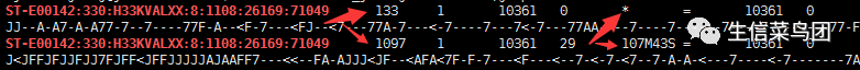 这也就是我为什么没有发现第7列有染色体,第3列是*号的reads。即使PE reads的右端匹配,左端未匹配,它只会把这个read比对的染色体写在第3列,而不是第7列!所以说要想探究它是左端还是右端未比对成功,得看flag。