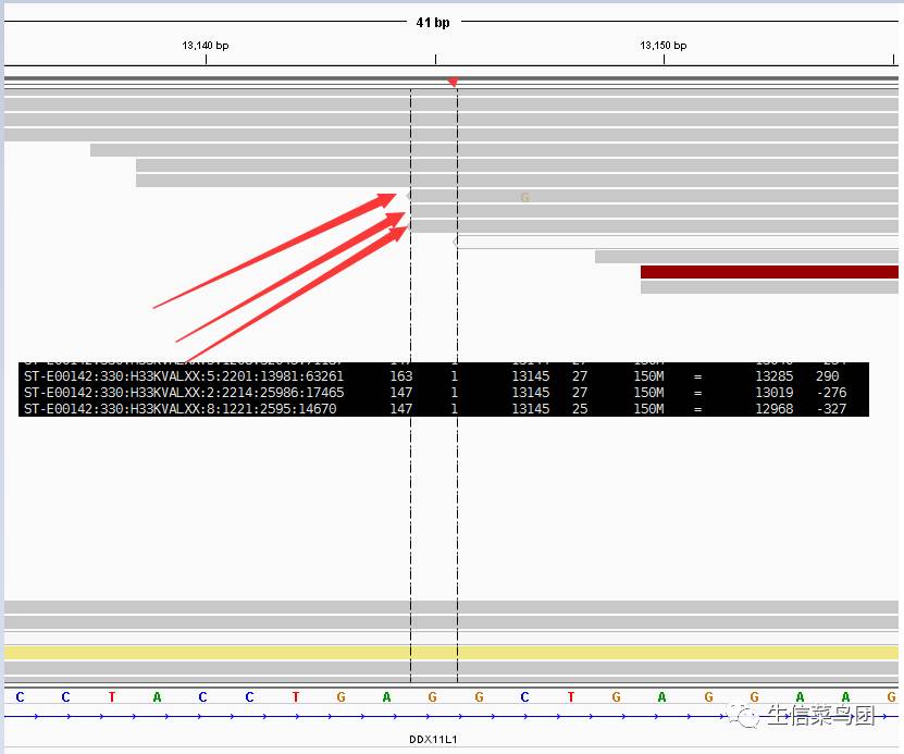 这3条reads虽然都比对到了1号染色体的第13145个碱基的位置,但是尾号为63261的reads跟另外两个的flag不一致,所以它被保留下来,而另外两条reads虽然flag一致,但是第九列插入片段不一致,也不会被当做duplication被去除。