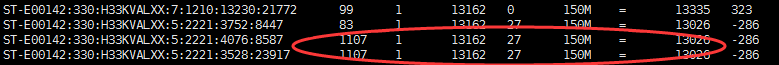 下面这种情况才是需要去除的PCR duplication,而且它们的flag是1017,代表它们的另一端read并没有成功比对。
