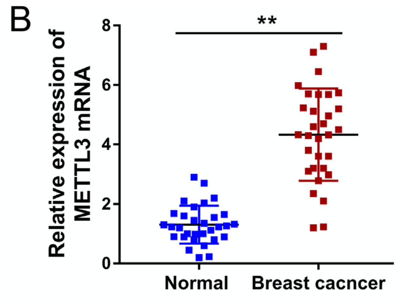 (B) METTL3 mRNA was analyzed by RT-PCR in the enrolled breast cancer individuals and controls.
