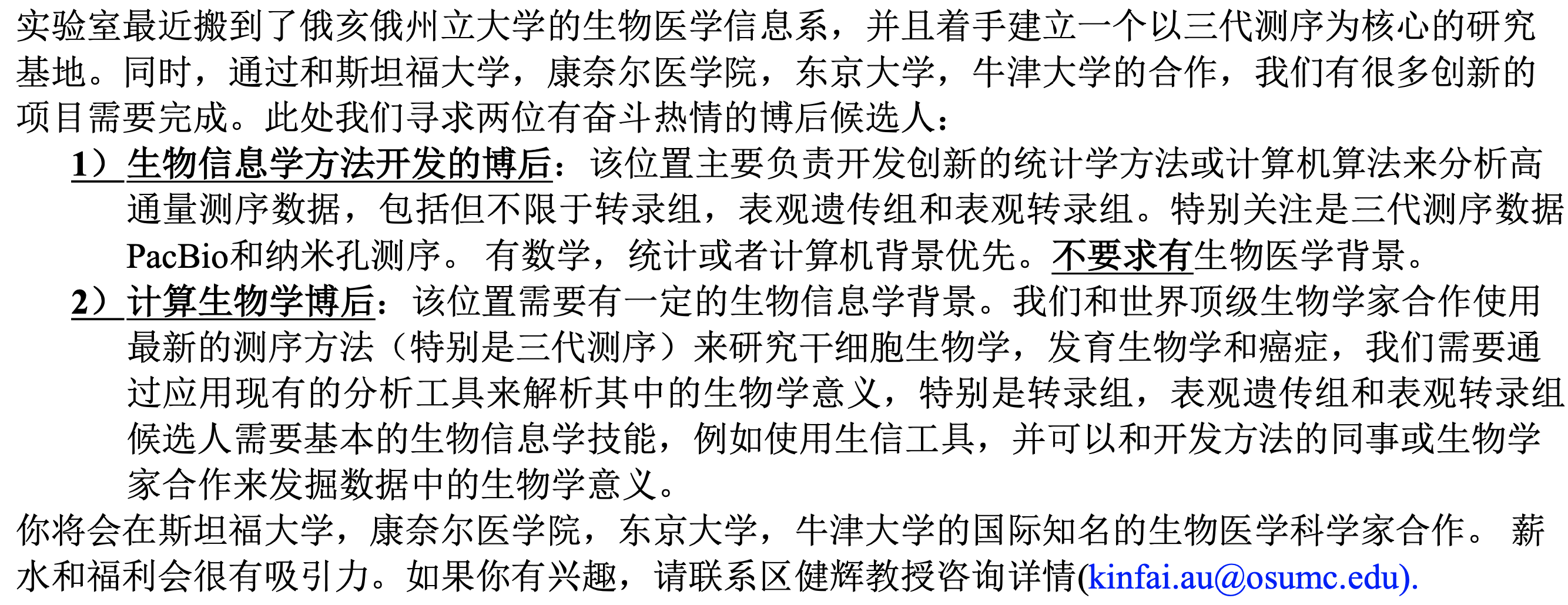 不过恰好有一个三代测序的研究实验室有博士后招聘,博士后训练机会,俄亥俄州立大学,生物医学信息系: