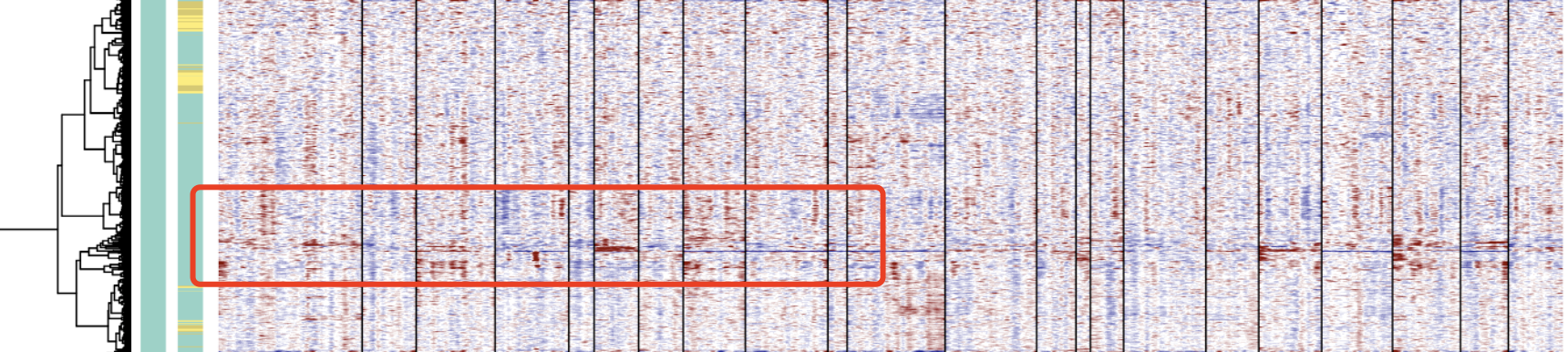 可以看到, 部分Fibroblasts和Endothelial_cells细胞我拿它们作为ref,理论上它们是不可能有CNV事件的,所以上面的热图的上半部分可以看到部分Fibroblasts和Endothelial_cells细胞都是比较整齐。而且,我在需要被检验CNV的细胞里面也掺入了部分Fibroblasts和Endothelial_cells细胞,它们也是没有CNV事件的,仅仅是上皮细胞可以看到泾渭分明的CNV有无的差异。