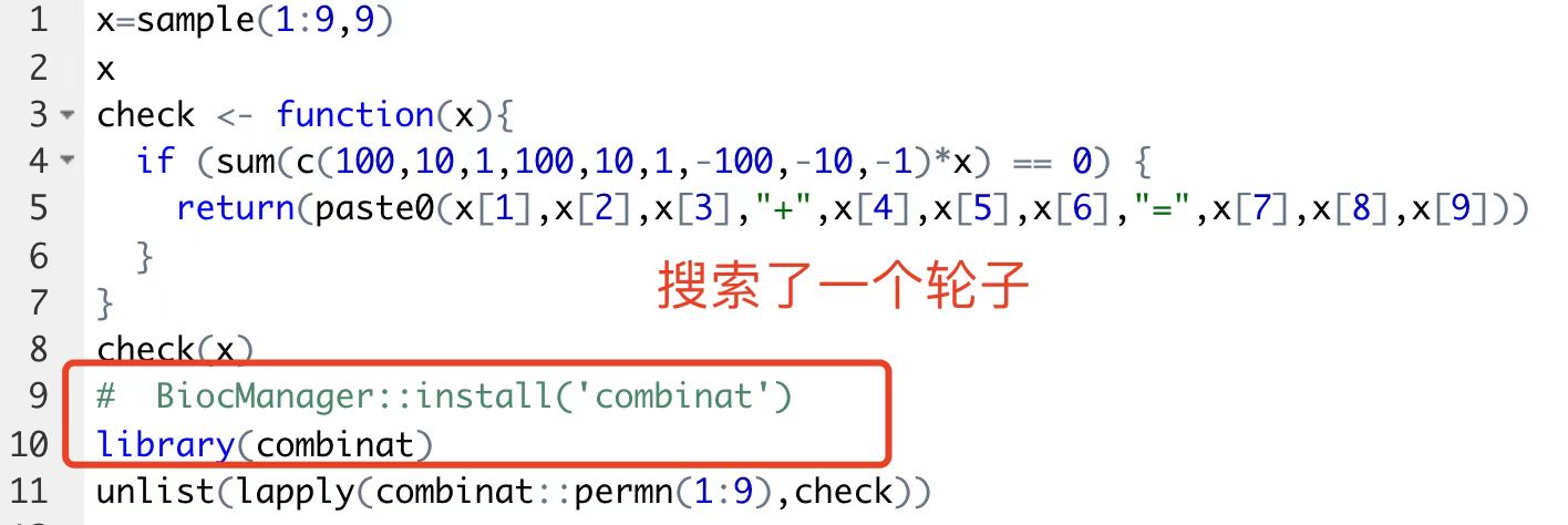 这样的1-9的数字不重复的组合其实是一个排列问题,有362880种形式,这个 combinat::permn 轮子超级好用: