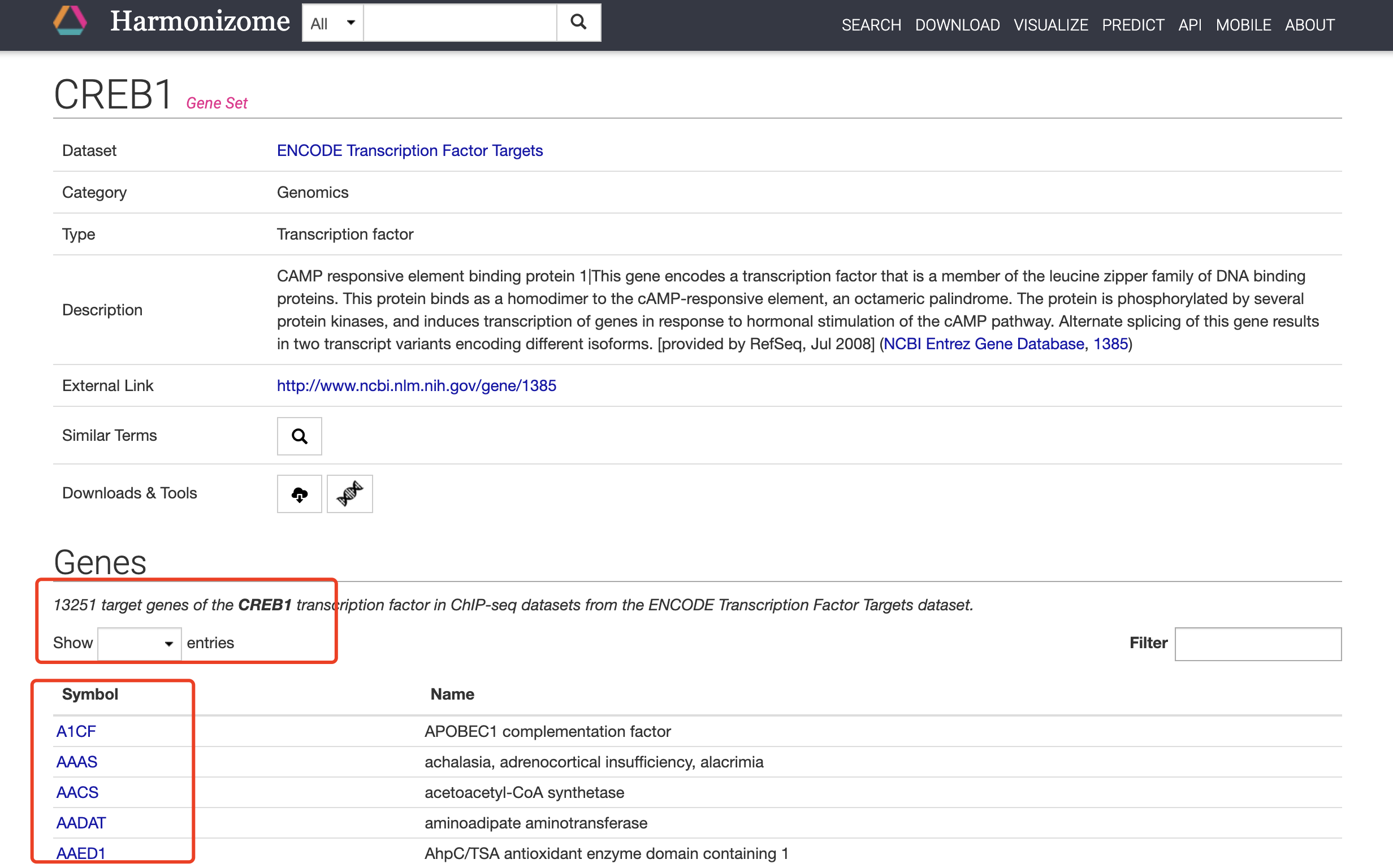 确实啊! 13251 target genes of the CREB1 transcription factor in ChIP-seq datasets from the ENCODE Transcription Factor Targets dataset.
