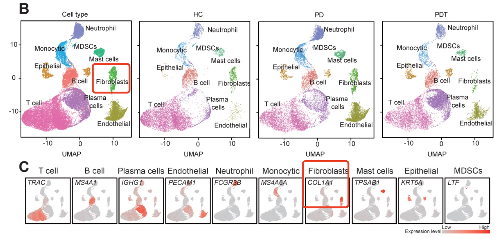 感兴趣成纤维细胞的非常多,可能主要是因为肿瘤领域的火爆,肿瘤微环境里面的免疫相关,不管是淋巴系还是髓系,都有了大量的 成果。反而是肿瘤微环境里面的基质细胞,比如内皮细胞,成纤维和周细胞目前还大有可为。