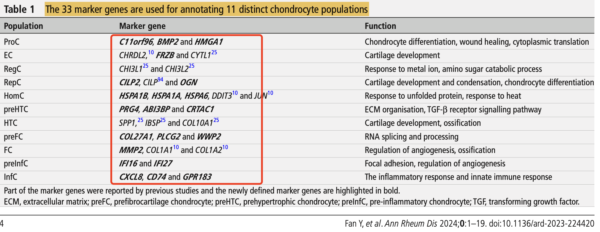 比如2024年1月的文章:《Unveiling inflammatory and prehypertrophic cell populations as key contributors to knee cartilage degeneration in osteoarthritis using multi-omics data integration》,它对应的数据集是: GSE255460 ,这个时候给出来了比较清晰的亚群,而且每个亚群的有生物学功能的基因列表都清晰可见: