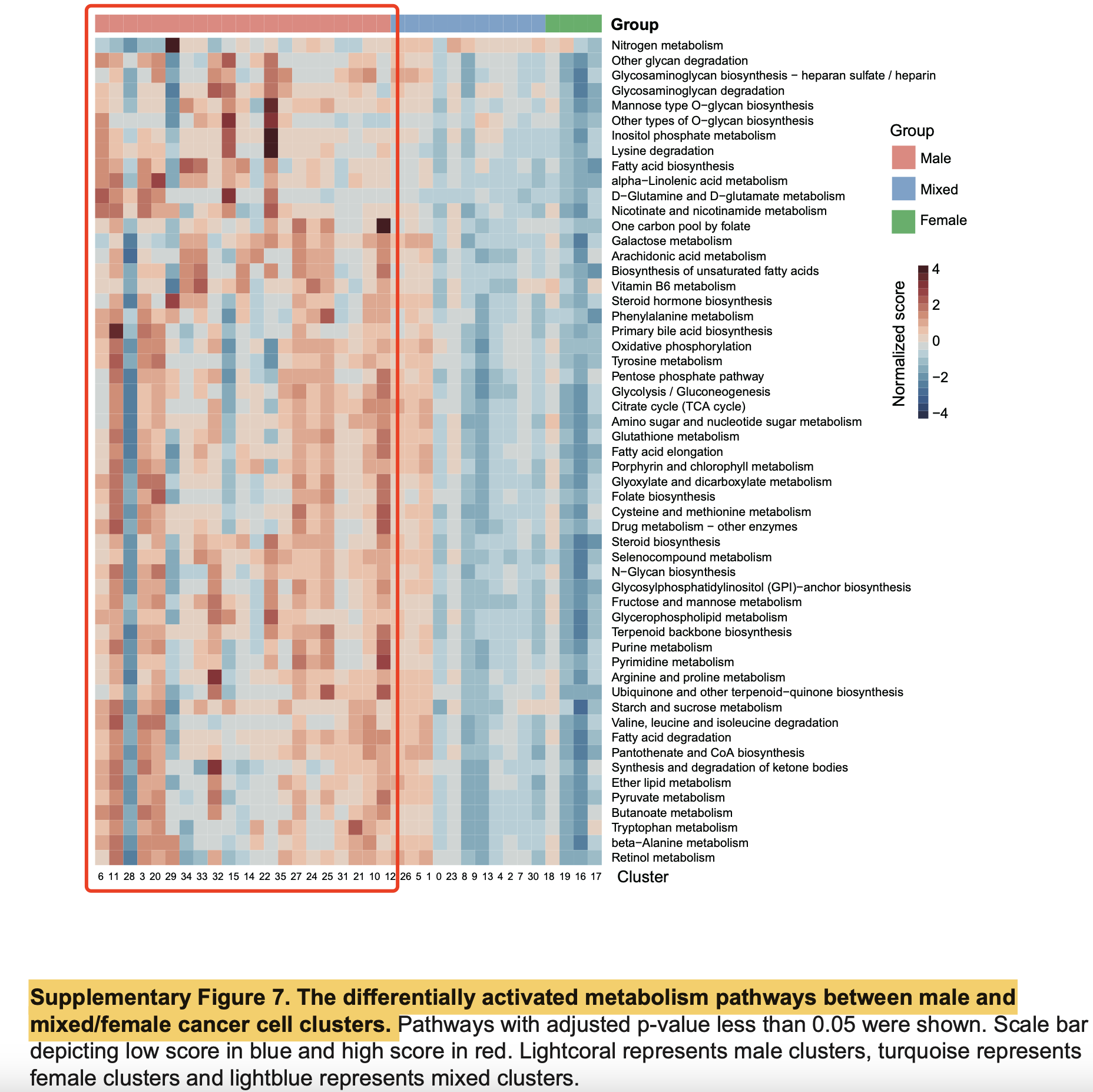其中附件有一张图是男性和女性的乳腺癌患者肿瘤细胞表达量差异基因的代谢通路打分后的差异热图,如下所示: