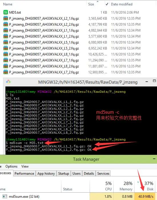 检查数据传输的完整性就是md5校验,看看数据在拷贝过程中有没有意外的损坏(这个在之前下载数据的时候我也说过)!一般传输数据之前,会用md5命令来生成各个文件的md5值,就是下面的MD5.txt文件里面的内容,然后传输数据之后,需要自行用md5sum -c MD5.txt 来校验文件里面记录的文件的完整性,如果显示都是OK,说明文件拷贝传输过程是没有问题的!但这个过程会耗费大量的磁盘读写,磁盘读写能力是有限的,所以开多个进程并不能加快这一过程。